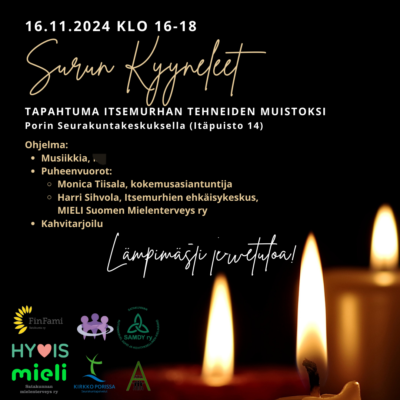 Surun liekki tapahtuma järjestetään yhdessä muiden toimijoiden kanssa 16.11. klo 16-18 Porin seurakuntakeskuksessa.